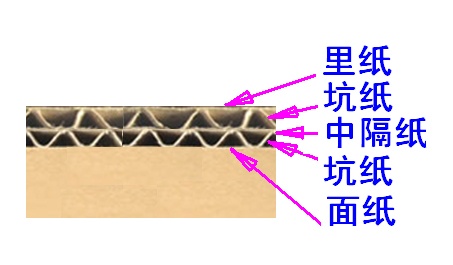 The double corrugated board structure is made of two layers of box board paper, two layers of corrugated core paper and one layer of sandwich paper. The sandwich paper is generally made of the same material as the core paper. Its structure is shown in the figure: